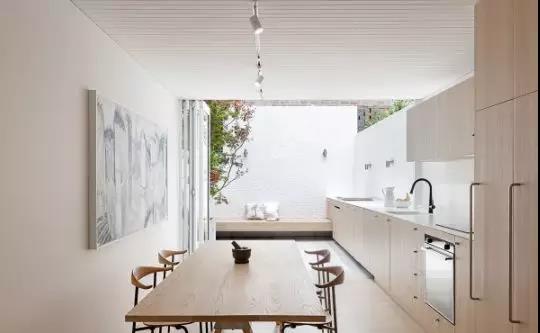 通常開方式的廚房里會有餐廳的部分,這間極簡風(fēng)格的廚房竟然沒有一絲油煙氣息,用餐環(huán)境也很優(yōu)雅。
