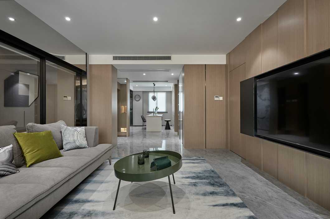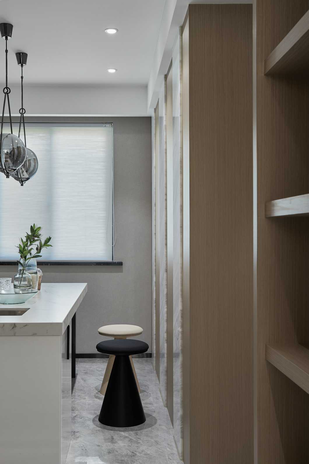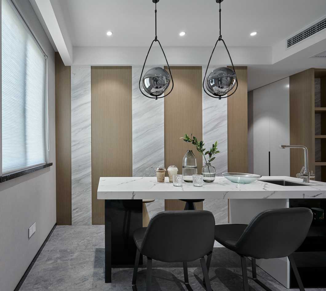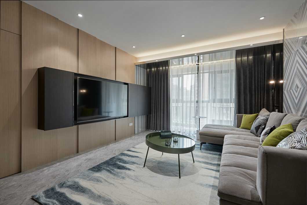 客餐廳縱向線條拉伸感極強(qiáng),不同材質(zhì)相互碰撞,以及恰當(dāng)?shù)墓庥皩^(qū)域空間揉為一個整體。電視背景墻高低錯落,并且把電視柜“抬”到了墻上,保留儲物功能的同時(shí)帶入了當(dāng)代設(shè)計(jì)流行元素。凝練簡約現(xiàn)代的生活質(zhì)感,光影襯出選材的自然肌理,在木頭的溫潤與石材的剛硬凌冽交織一起,勾勒出獨(dú)特的空間氣質(zhì)。