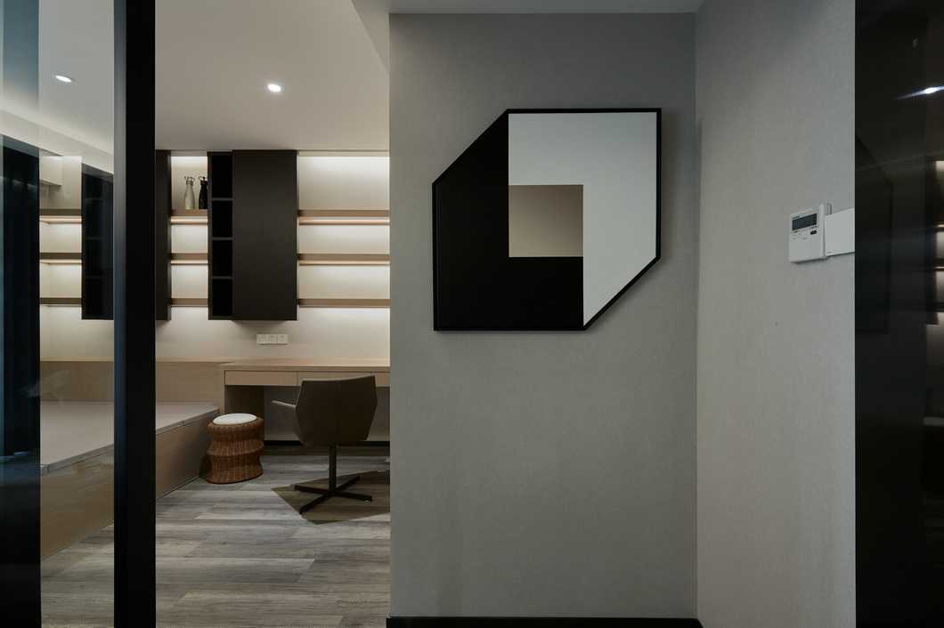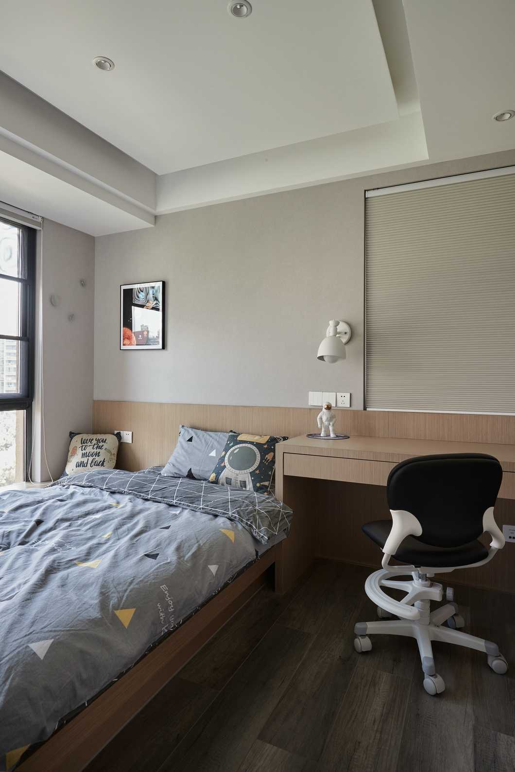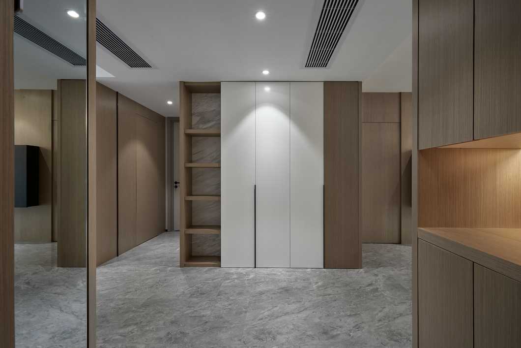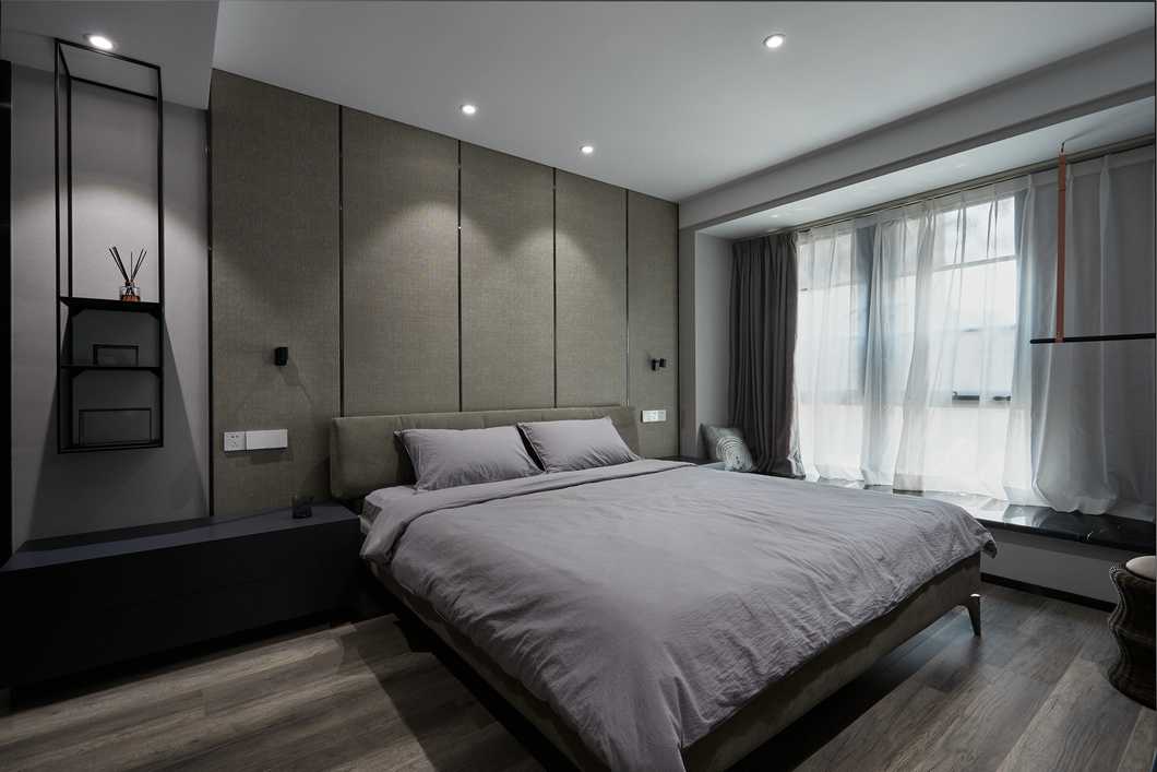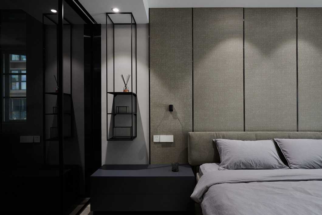 主臥的色調(diào)略顯深邃,灰色的墻紙與深色家具靜謐感十足。公區(qū)的縱向線條感被換了形式的引入進(jìn)來,設(shè)計(jì)思路貫穿其中。