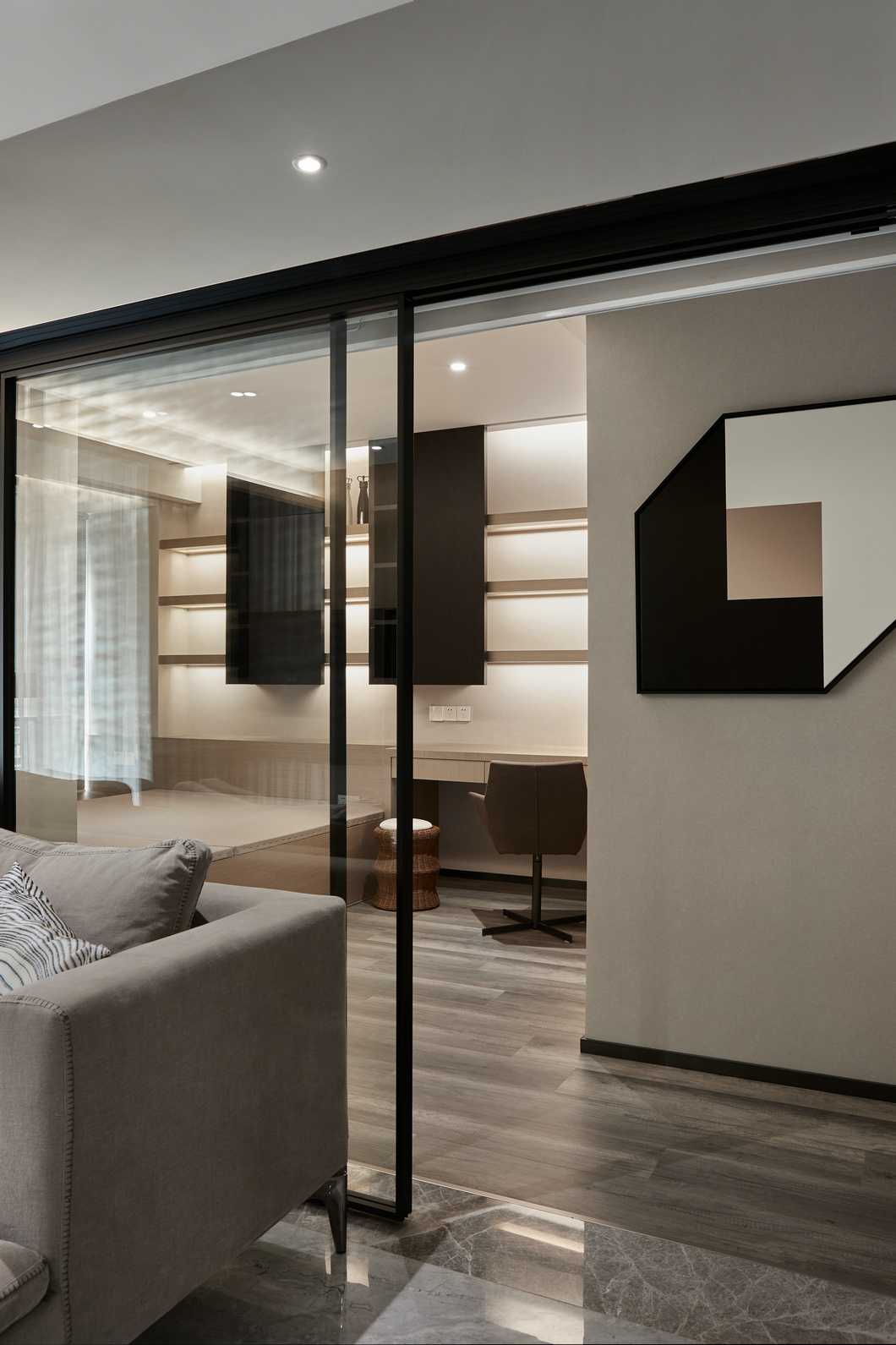 書房于客廳僅一扇移門為界,通透的玻璃讓兩個空間保持獨(dú)立的同時(shí)增加了許多互動感,釋放了空間的可能性